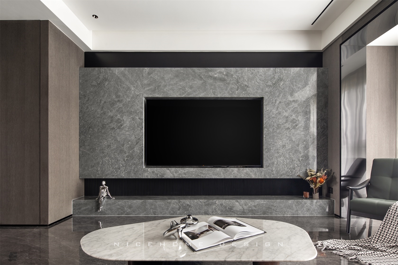 大理石電視背景墻搭配淺咖色科技布材質(zhì)沙發(fā),加上木飾面和木格柵的造型,使空間散發(fā)出靜默恬淡的氣息,讓內(nèi)心復(fù)歸于平靜。