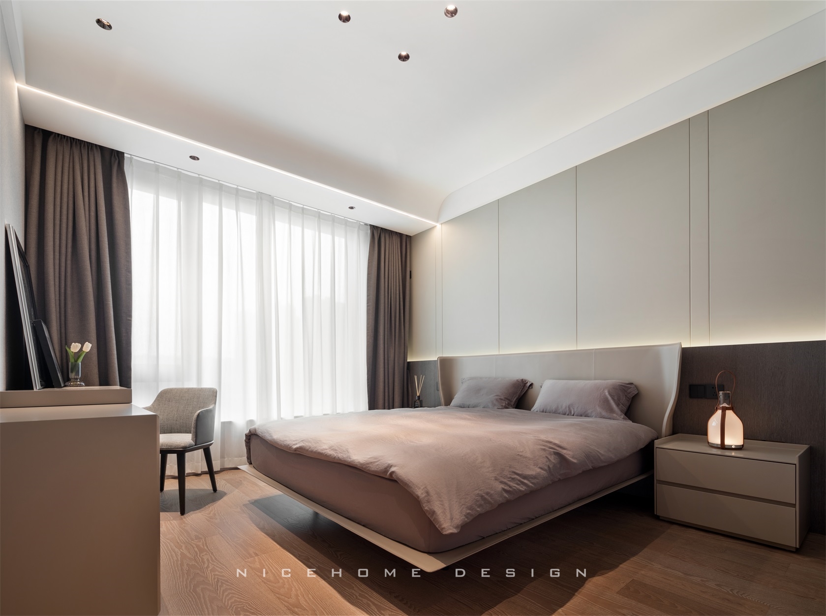 主臥背景墻使用硬包和木飾面做出簡單的層次,吊頂部分“凹出”一個彎曲的弧度并以燈帶補(bǔ)充結(jié)構(gòu)造型,為空間增添高級的質(zhì)感。