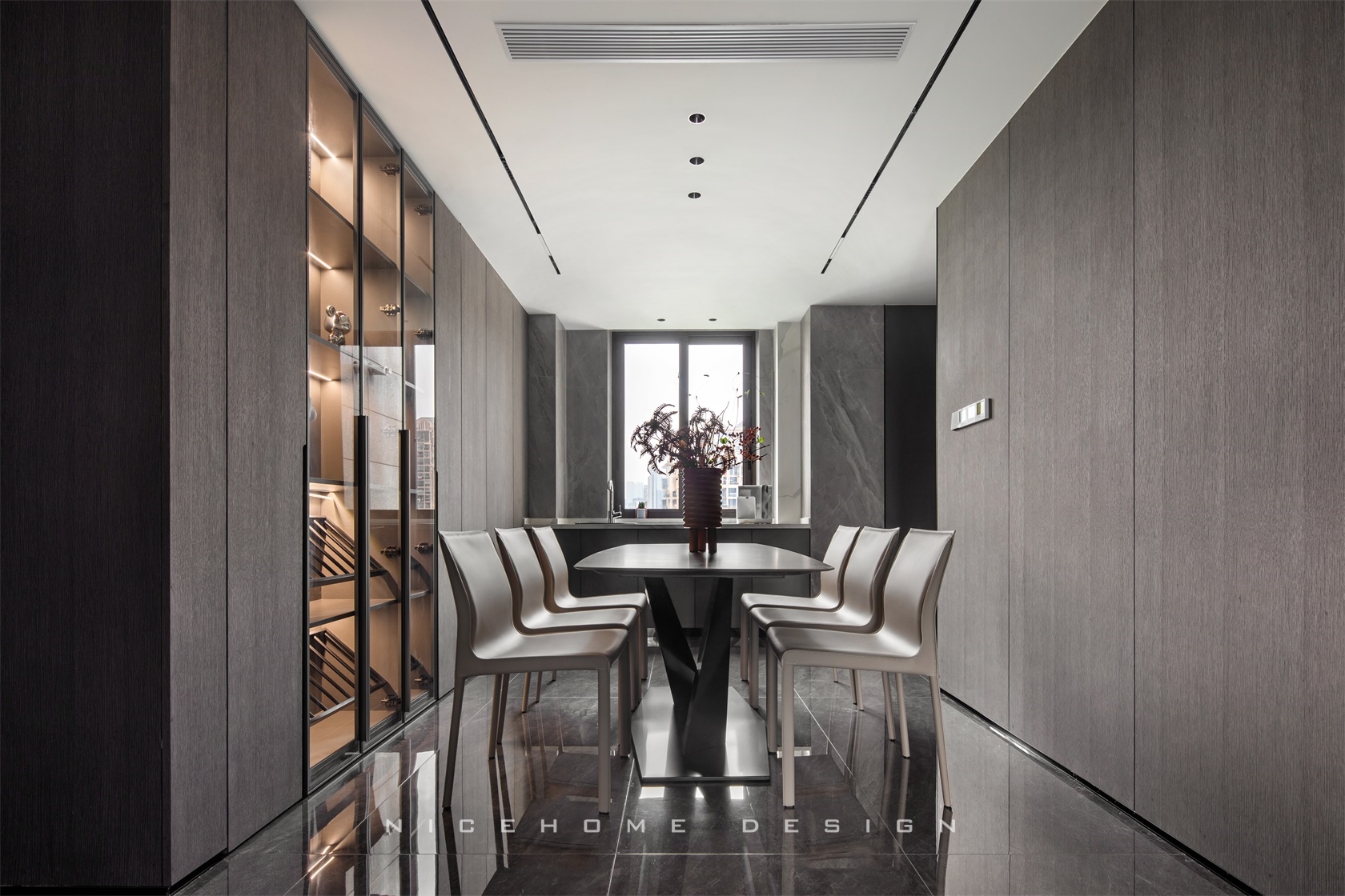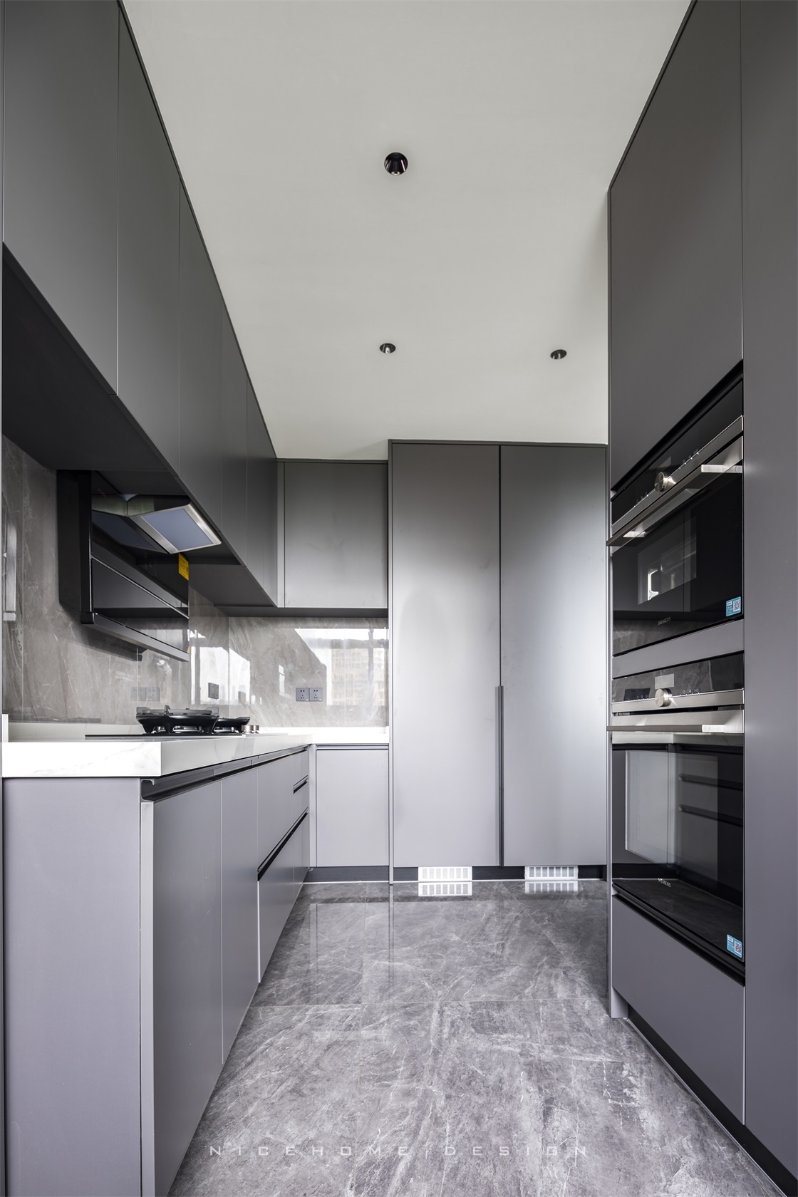 井井有條的現(xiàn)代廚房,無論廚電還是物件,都完美隱藏在柜體中,保持外觀的極致簡潔,統(tǒng)一的高級灰色彩也讓廚余之地更顯大氣。