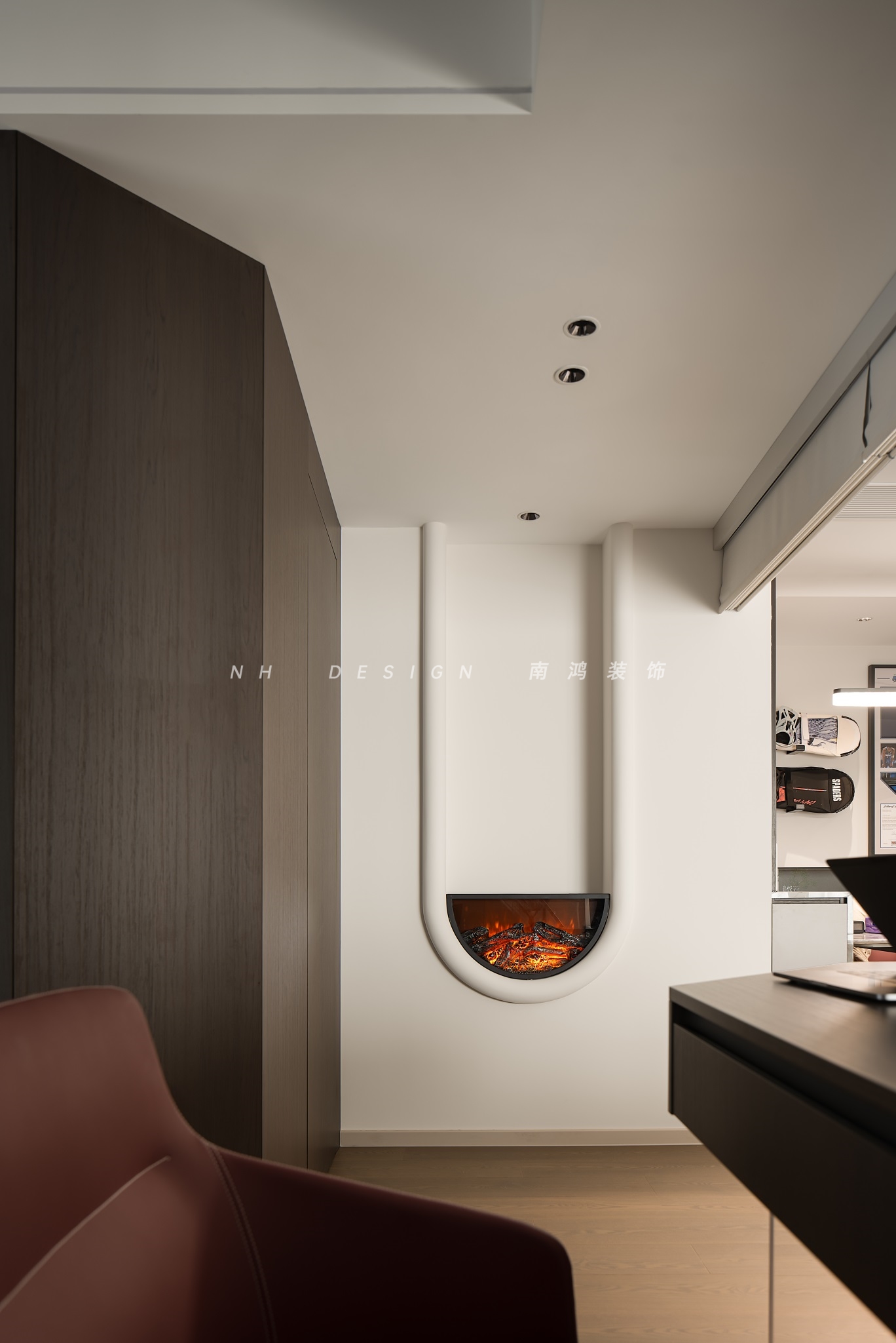辦公區(qū)后方置入臥榻與簡潔的儲物區(qū),提升實用性,書桌一側(cè)墻壁則利用電子壁爐和倒拱造型,營造極富優(yōu)雅氣質(zhì)的藝術(shù)小景。