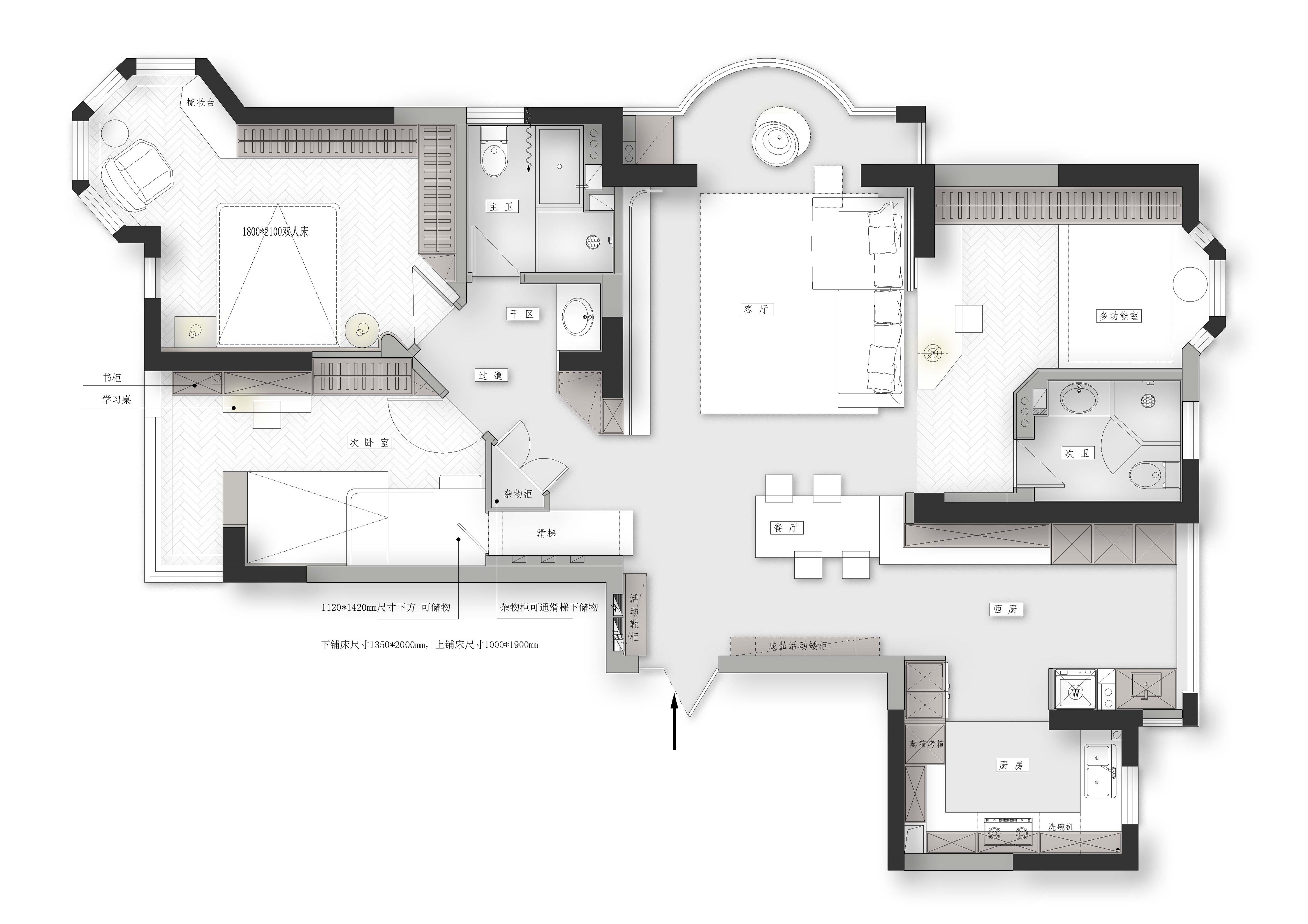 餐廚互通的格局令光線十分通暢,餐廳一路向陽臺里側(cè)延伸出西廚區(qū),定制的餐邊柜展現(xiàn)功能與美學的融合,有效增加了備餐區(qū)面積以及小家電的使用空間。